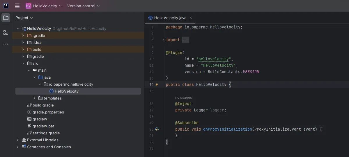 You should now have a project set up with Velocity as a dependency. All you have left to do now is to compile your plugin and run it on a Velocity server.